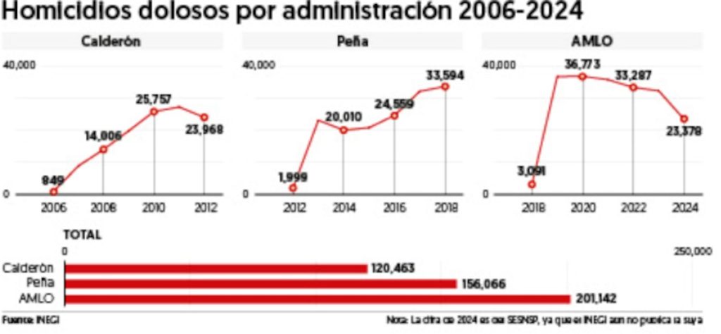 El sexenio de López Obrador concluyó, según dichas fuentes, con 201 mil personas asesinadas, lo que significa que la política de “abrazos y no balazos”, y la demagogia de ir a resolver las causas y no los efectos, simple y llanamente no funcionó. Ha sido el sexenio más violento desde la etapa de Salinas de Gortari (67 mil), superando a Zedillo (79 mil), Fox (60 mil), Calderón (122 mil) y Peña Nieto (150 mil), homicidios en números redondos. Y es temprano para afirmar si la tendencia seguirá al alza.